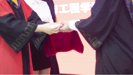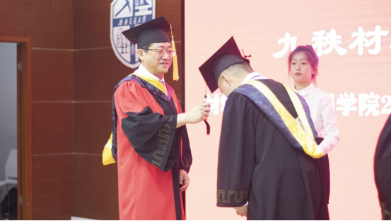 紧接着进行了授位仪式。同学们身着学士服依次上台,材料学院院长、学位评定分委员会主席、主礼教授朱旻昊为他们逐一拔穗,200多名毕业生,200多次握手,200多次拨穗,每一个瞬间都将定格,在记忆的长河里熠熠生辉。授位仪式神圣而庄严,标志着大学生活圆满结束。拨穗正冠,代表稻穗或麦穗成熟,象征学子们已学有所成,即将展翅高飞,同时也寓意学子们在岁月的征程中行稳致远。