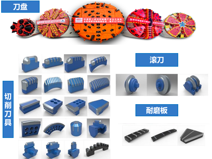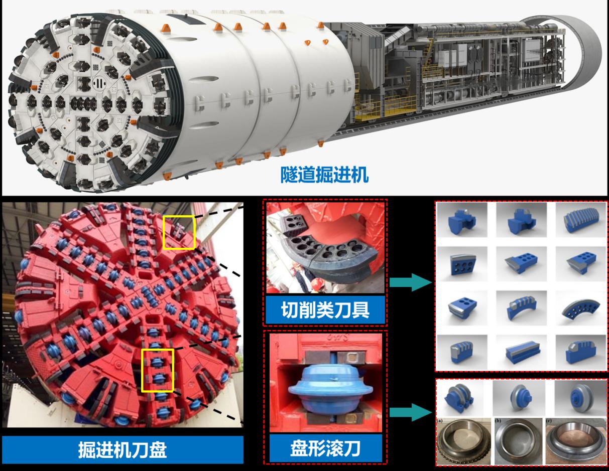 掘进机面临大型化、刀盘结构形式多样化,以及穿越铁路、河流、构筑物带来的高风险性等难题,要求其“掘得进,排得出,稳得住,耐得久”。刀盘刀具是掘进机的“铁嘴钢牙”,是确保掘进安全、效率、成本的核心,在复杂地层、长距离连续掘进条件下,刀具线速度高,磨损、冲击剧烈,传统切削刀具合金韧性差,钎焊强度低,易崩刃、掉块,滚刀耐磨性差导致掘进效率低,无法适应隧道建设中各种地层的长寿命高可靠掘进需求,严重制约我国掘进装备升级大发展。高性能刀盘刀具长期依赖进口,国外对中国技术封锁,严重“卡脖子”。传统国产刀盘刀具性能较差、寿命较短,开仓和刀具更换风险大,常导致重大工程事故。