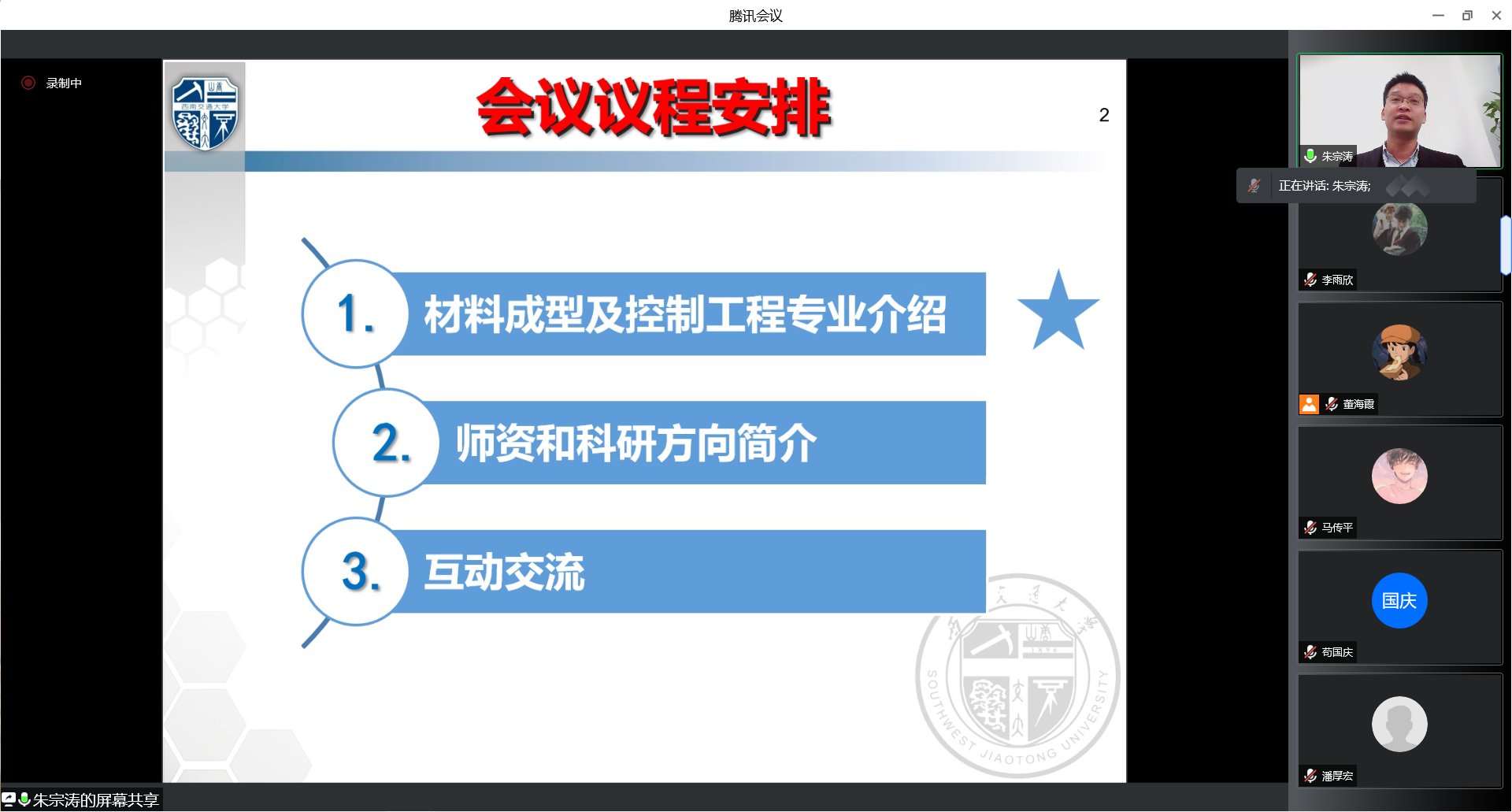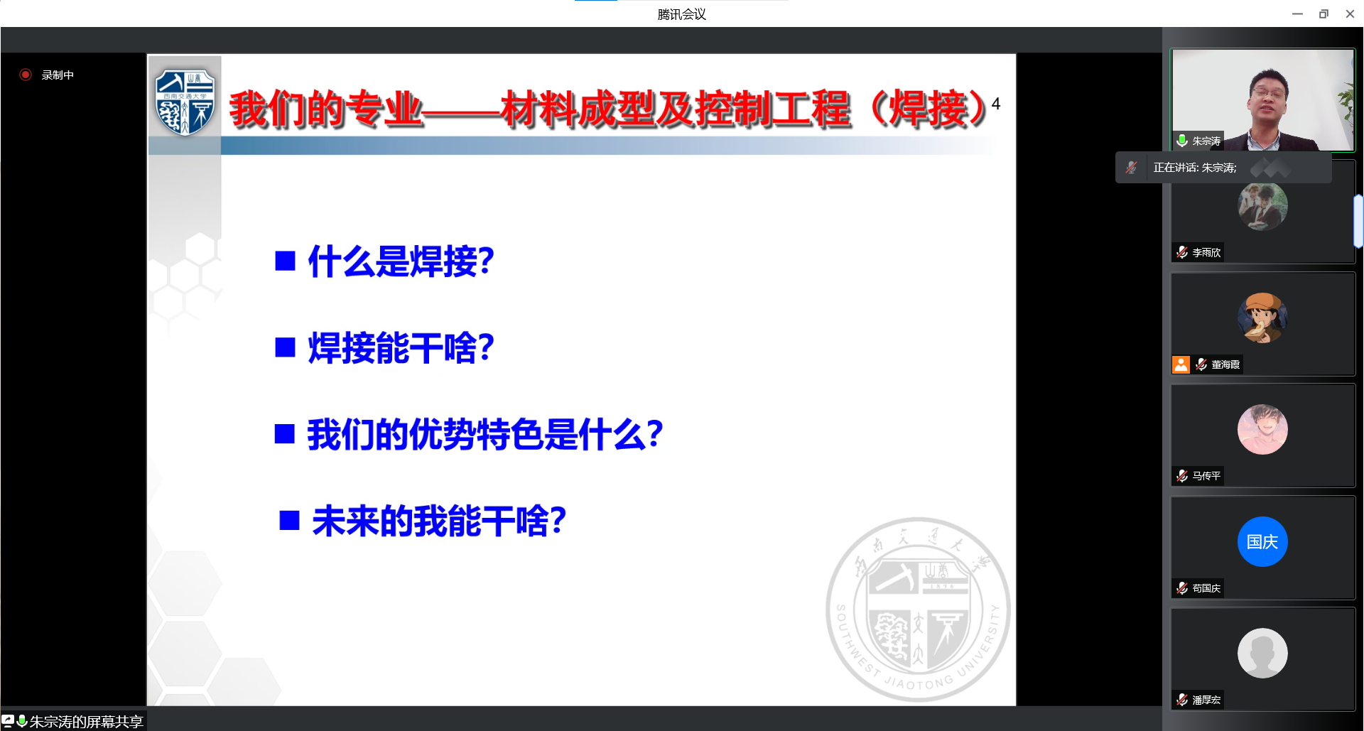 2021级本科生专业分流宣讲会——材料成型及控制工程专业专场在线上平台举行。出席本次宣讲会的专家教授和老师有吕其兵、苟国庆、骆德阳、李达、马传平等。2021级材料大类专业本科生参加。本次宣讲会由材料加工系主任朱宗涛老师主持。
