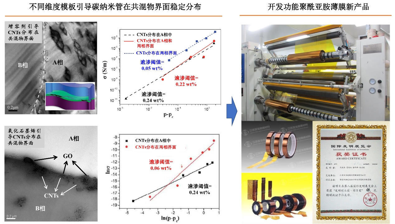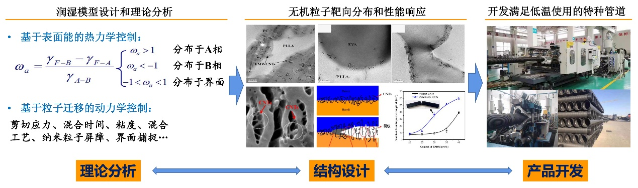 团队发明了无机粒子强韧化高分子复合材料的界面选择性分布控制技术,解决了复合材料增强增韧相互制约的难题。利用该技术开发的高强韧地下管道专用聚烯烃,可用于解决聚烯烃管道在长时低温条件承压能力不足、易开裂的严重问题,保障了聚烯烃管道在高海拔、高寒地区工程应用的可靠性。发明了不同维度模板引导碳系无机粒子在共混物界面稳定分布构筑三维导电网络技术,在极低导电粒子用量下获得高导电性能,成功应用于功能聚酰亚胺薄膜新产品开发,实现规模化生产。产品性能国内领先,打破了美国杜邦在聚酰亚胺薄膜产业上技术封锁、产品垄断的局面。