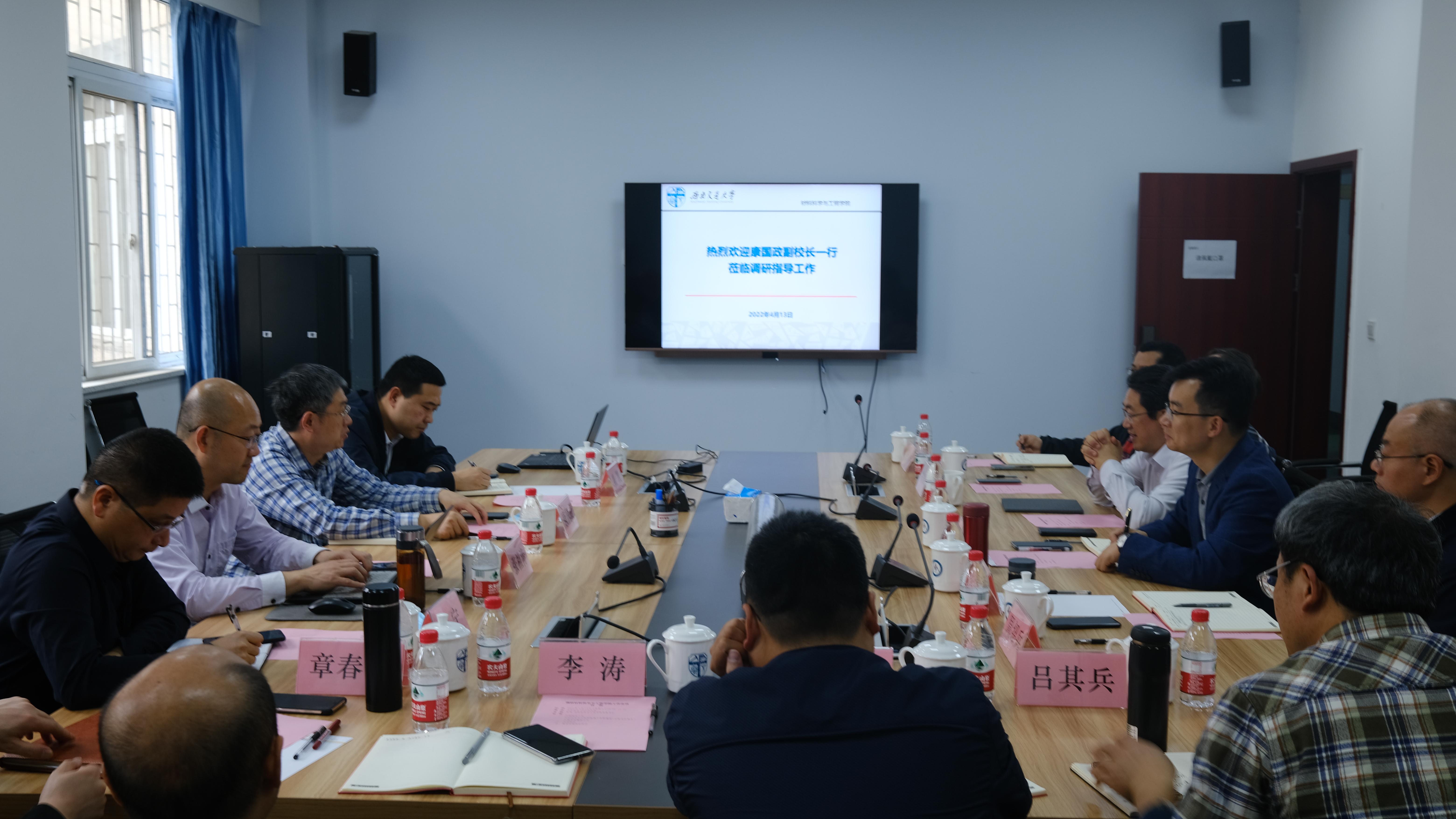 朱旻昊代表学院对副校长康国政一行到学院调研指导工作表示欢迎。会上,学院本科教学主管蒋小松从学科科研、师资队伍、人才培养、双万建设、卓越班培养体系等方面汇报了学院本科教学工作。
