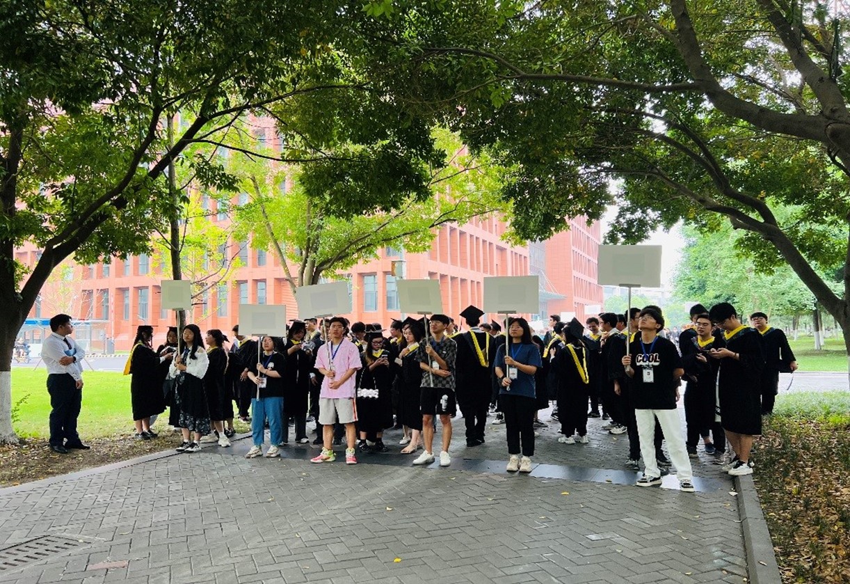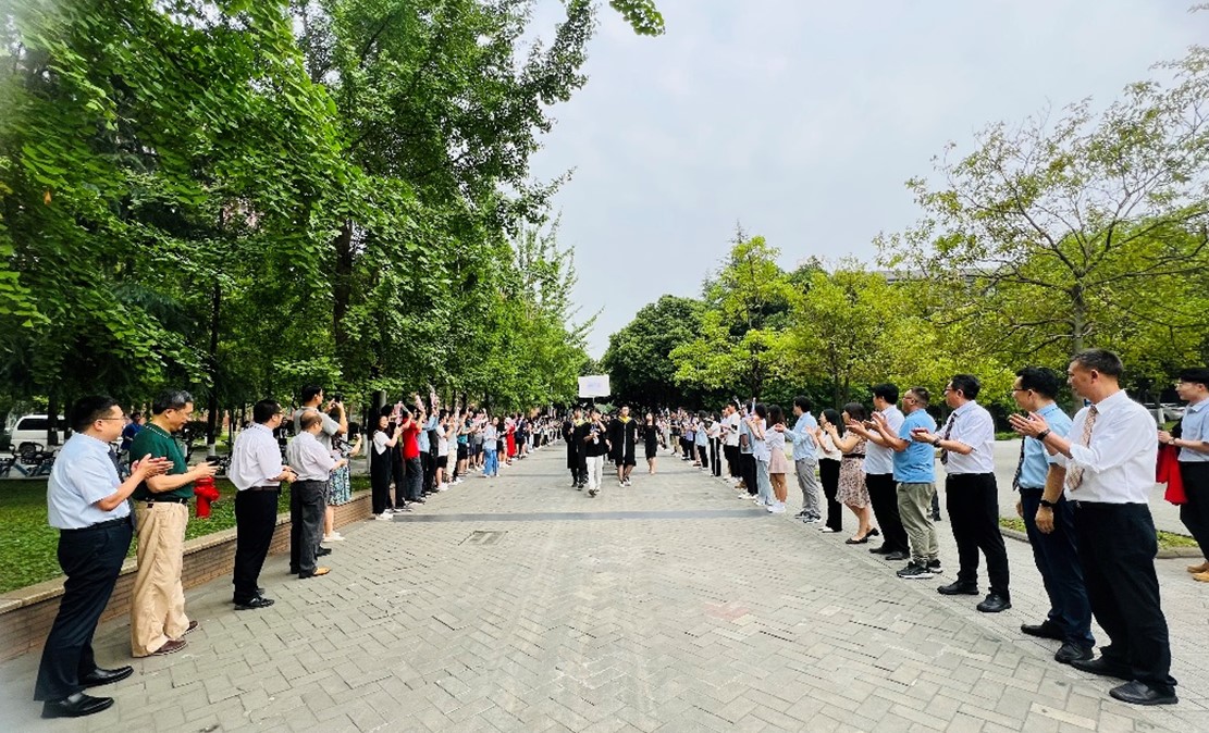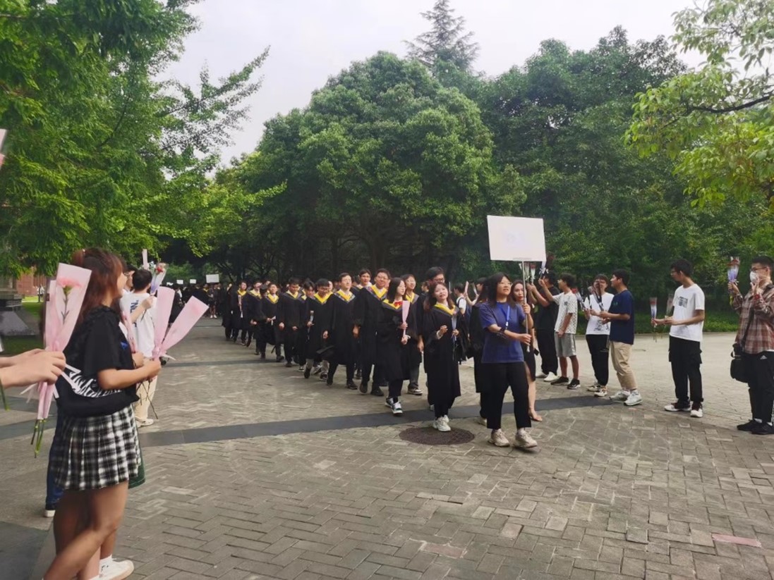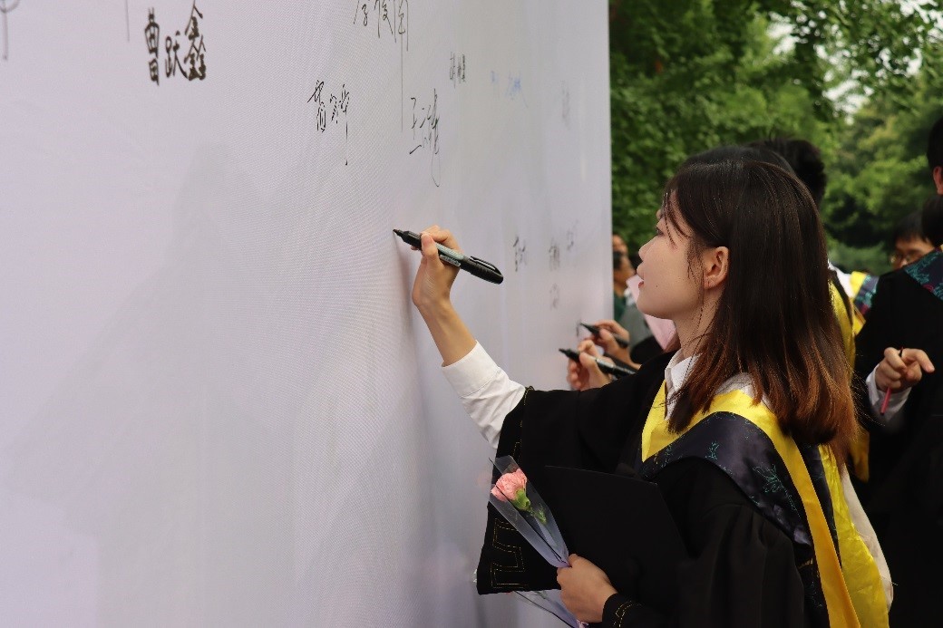 上午8:00,入场式正式开始,到场的领导老师、低年级同学在入场区两边提前等候,夹道欢迎。同学们顺着欢迎区有序步入,与老师们逐一握手,并在留言墙签下姓名,迈入典礼现场。入场式隆重而又温馨,寓意着伴随着师长、同学的祝福,毕业生们即将结束大学本科旅程,开启新的人生征程。