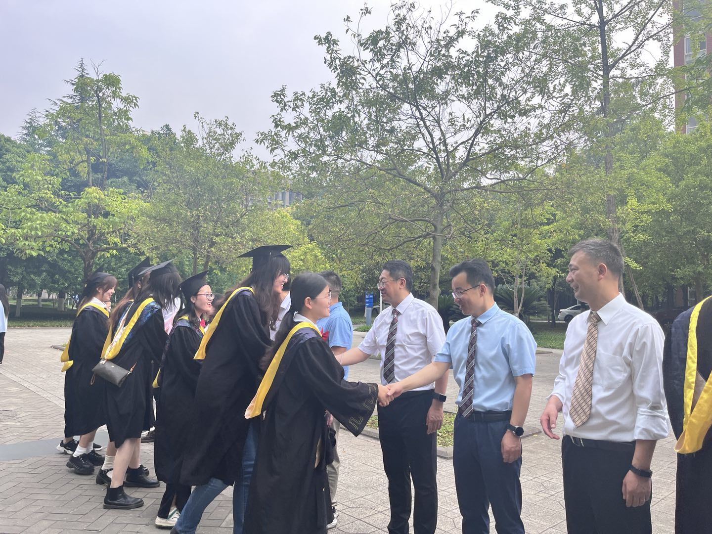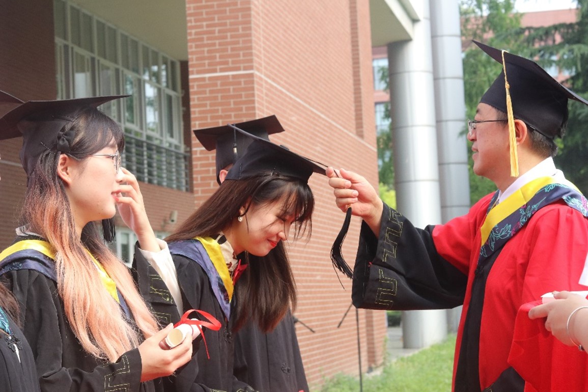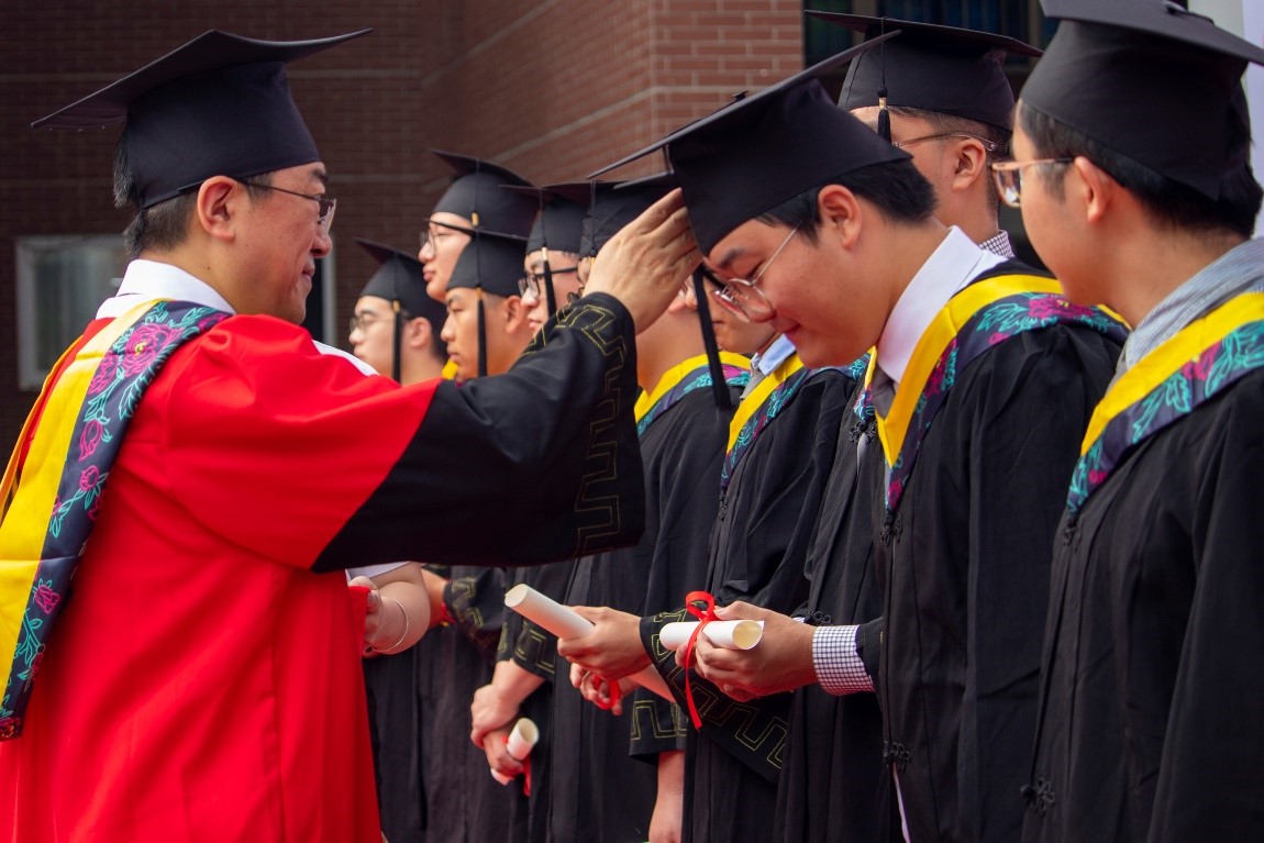 毕业典礼环节结束,授位仪式正式开始。授位仪式神圣而庄严,标志着大学生活圆满结束。拨穗正冠,代表稻穗或麦穗成熟,象征学子们已学有所成,即将展翅高飞,同时也寓意学子们在岁月的征程中行稳致远。同学们身着学士服依次上台,材料学院院长、学位评定分委员会主席、主礼教授朱旻昊为他们逐一拔穗, 200多名毕业生,200多次握手,200多次拨穗,每一个瞬间都将定格,在记忆的长河里熠熠生辉。