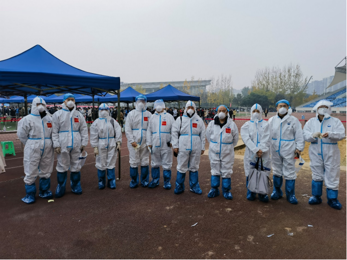 鉴于当前成都市疫情防控形势和新冠病毒变异的新特点,为全面摸排疫情防控风险点、快速切断本土疫情传播链,做到“早发现”“早处置”,切实维护和保障全校师生的生命安全和身体健康,根据成都市新型冠状病毒肺炎疫情防控指挥部通告(2022年第20号)要求,近日学校在犀浦,九里两校区组织开展全员核酸检测。经教职工个人报名,学院党委组织推荐,材料学院14名教职工担任了11月24日校内核酸检测志愿者,在犀浦校区北区田径场协助核酸检测扫码等工作。