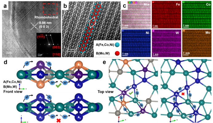 徐轶团队结合元素的类比性和结构的特殊性,并通过混合熵将两者联系起来设计了一种具有吸附-解吸自循环结构的非贵金属高熵合金纳米催化剂。在FeCoNiMoW HEA的FCC基体中,析出了大量具有斜方体结构的高熵纳米颗粒(HEA NPs)。通过组合和优化五种金属元素,实现了M-H键的强度和析氢自由能的最佳匹配。进而设计了一个具有原子自循环"生态系统"的HEA纳米结构。调整了FeCoNiWMo HEA NPs中的Co/Mo元素比例,证实了有序结构HEA NPs的含量与析氢性能呈线性关系。此外,球差透射电子显微镜(TEM)观测和密度泛函理论(DFT)计算详细揭示了其优异的性能归功于斜方体晶体结构和由金属原子选择性替代组成的自循环"生态系统"。在HER中,催化剂在碱性和酸性条件下电流密度为10 mA·cm-2的过电位分别只有35 mV和81 mV,而且该催化剂在工作48小时后仍具有良好的稳定性。更具吸引力的是,FeCoNiWMo HEA催化剂的成本仅为商业Pt/C电极的0.04%。