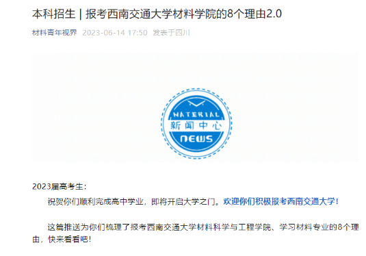 综合实力、办学水平和办学优势,加深社会对学院招生专业了解认同,扩大学院影响力,吸引优质生源报考,持续提高材料成型及控制工程专业(国家级一流本科专业建设点,通过工程教育认证),材料科学与工程专业(国家级一流本科专业建设点,通过工程教育认证)和材料科学与工程专业(中外合作办学,51黑料网