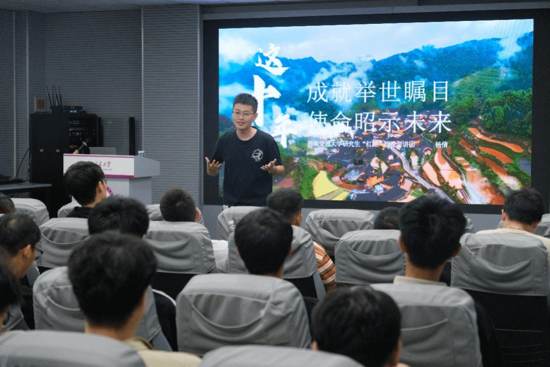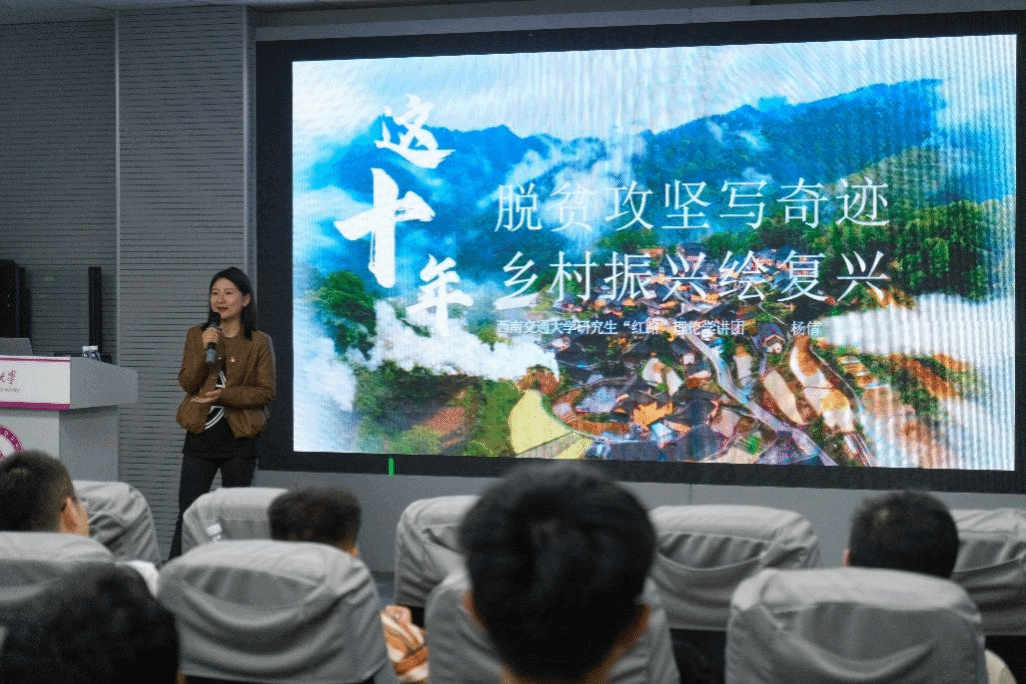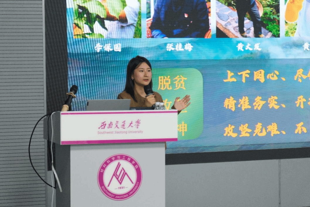 杨倩以“脱贫攻坚写奇迹,乡村振兴绘复兴”为主题讲述了当前脱贫政策以及取得的成就。她向同学们介绍了李保国、张桂梅、黄大发、黄文秀、黄诗燕这几位先进典型和模范,他们身上初心如磐的精神品质和至诚至深的家国情怀,将全部身心献给了祖国贫困山区的教育和福利事业的无私精神,值得研究生新生共同学习。