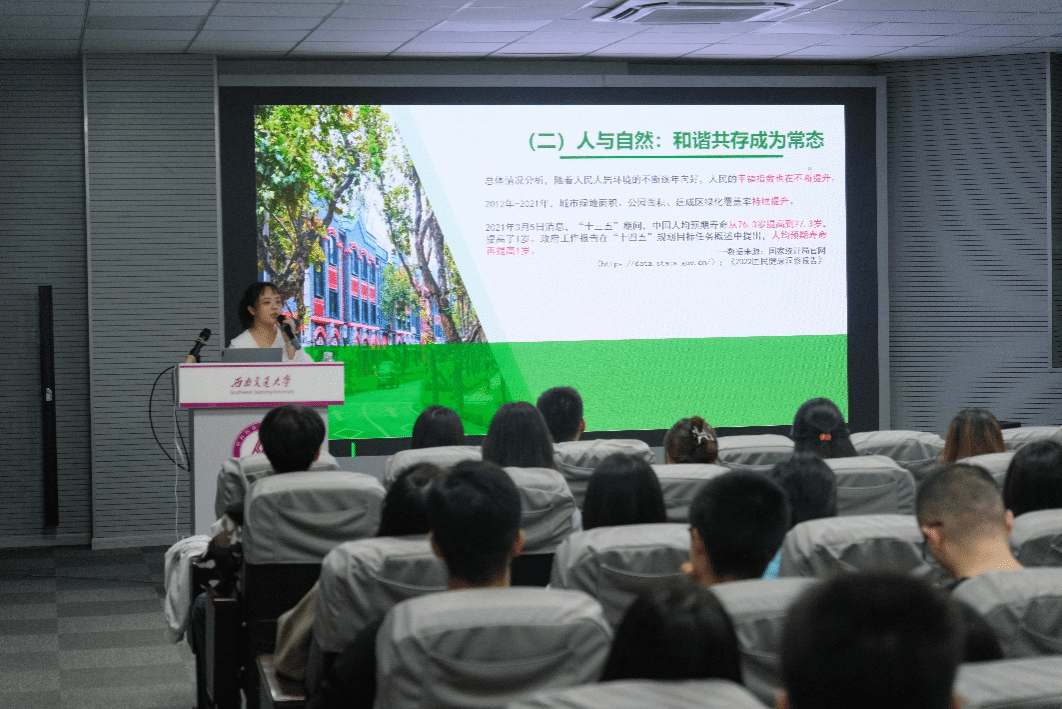 钟蔓君围绕“大道笃行系苍生,‘美丽中国’远必至”的主题进行分享讲解,她从“发展与自然”和“人与自然”两方面切入,以环保青年的视角,回看十年来中国的生态建设之路,介绍成就、深挖其原因并以历史为起点展望青年生态建设的新征程。她号召同学们在资源约束日益收紧,环境污染严重,生态系统退化的情况下,树立起尊重自然、顺应自然、保护自然的生态文明观念,走上可持续发展的道路。