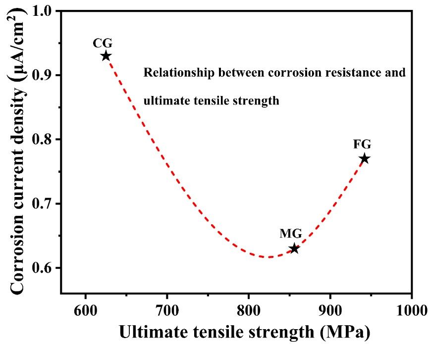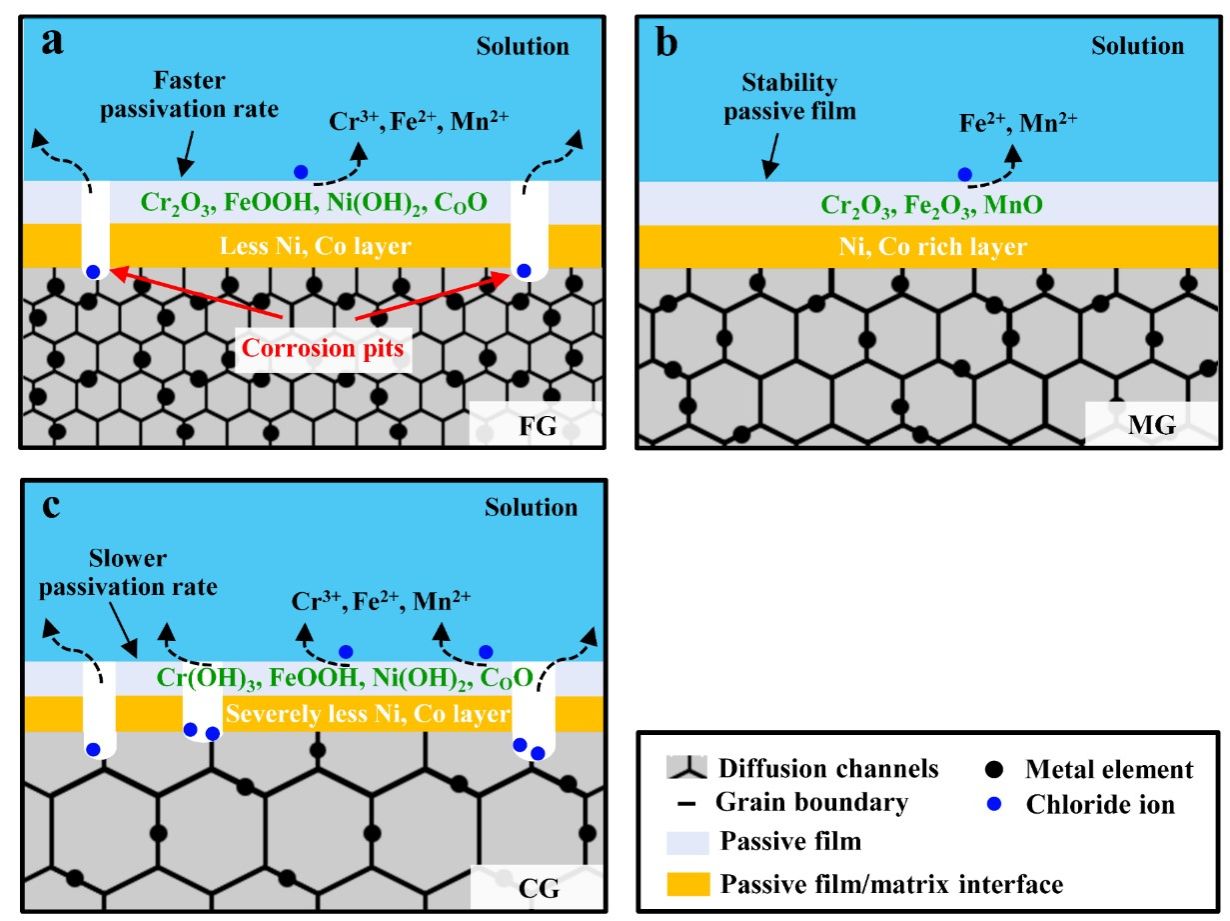 马新凯副教授等人以Fe40Co20Cr20Mn10Ni10亚稳态高熵合金为研究对象,通过大应变量轧制和再结晶退火制备了具有不同晶粒尺寸的试样,采用多尺度结构表征和电化学方法研究了晶粒尺寸对其腐蚀行为和机械性能的协同效应。区别于先前的研究,本工作更关注不同晶界密度引起的钝化膜特性差异及其对钝化膜溶解和点蚀形成的影响,阐明了不同晶粒尺寸亚稳态高熵合金的腐蚀机理。同时,基于耐腐蚀性和机械强度之间的关系,讨论了耐腐蚀性和强韧化协同作用机制,为制备出高强耐腐蚀材料提供了一定的参考价值。