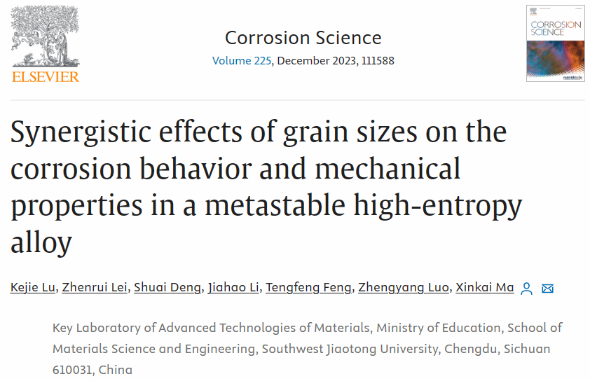 材料服役安全工程系马新凯副教授以通讯作者在Corrosion Science (中科院一区Top期刊,IF = 8.3)上发表题为“Synergistic effects of grain sizes on the corrosion behavior and mechanical properties in a metastable high-entropy alloy的研究论文,该论文的第一作者为2021级硕士研究生陆科杰。