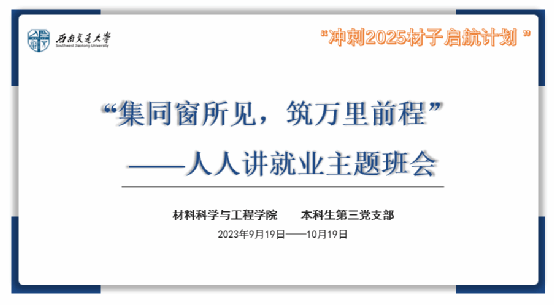 编者按:就业是民生之本,教育是民生之基。习近平总书记反复强调,就业是永恒的课题。总书记2022年来川考察时要求,要做实做细就业指导服务。为深入贯彻落实习近平总书记关于就业工作的重要指示,扎实推进2025届就业工作,材料学院本科2021级以“工作前置,细化指导,多路并进”为原则,精心谋划了“冲刺2025材子启航计划”,旨在帮助大三学生全面了解就业、考研、留学形势,持续改进个人生涯规划,明确发展目标,为学生成长赋能。