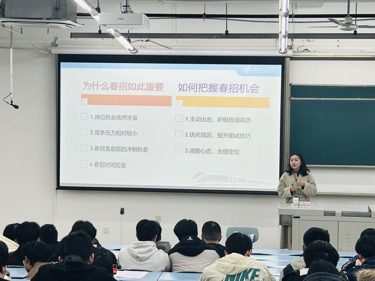 交流结束后,马娟分析了当前同学们的学分通过情况,着重强调毕业要求,提醒大家对照要求仔细核实自身毕业资格,确保顺利毕业。张若男再次强调了春招的重要性,指出这是应届毕业生求职的关键阶段,机会宝贵且竞争激烈,鼓励大家以积极的态度迎接春招,全力以赴。