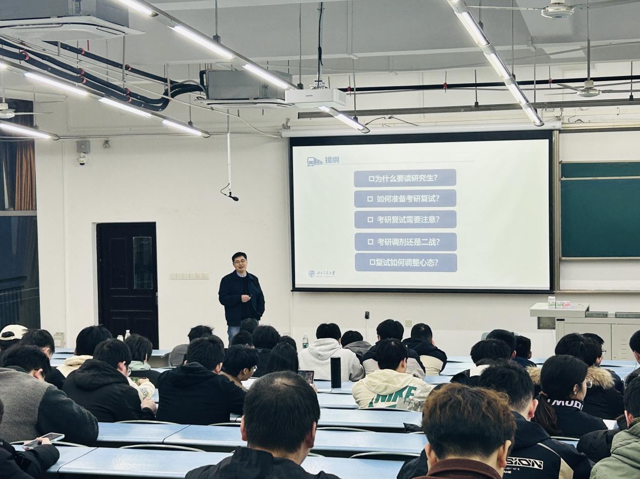 随后,蒋小松从“为什么要读研究生”“如何准备考研复试”“考研复试注意事项”“考研选择调剂还是二战”等五个方面向同学们细致地阐述了备考策略,并给出了切实可行的具体建议,从仪表仪态到答题思路,事无巨细。他深入剖析当下的考研形势,指出复试调剂这一环节的重要性,提醒同学们务必全面了解复试流程。此外,蒋小松还建议考生们合理规划备考时间,高度关注复试动态,确保能及时获取最新信息,为复试做好全方位的准备。
