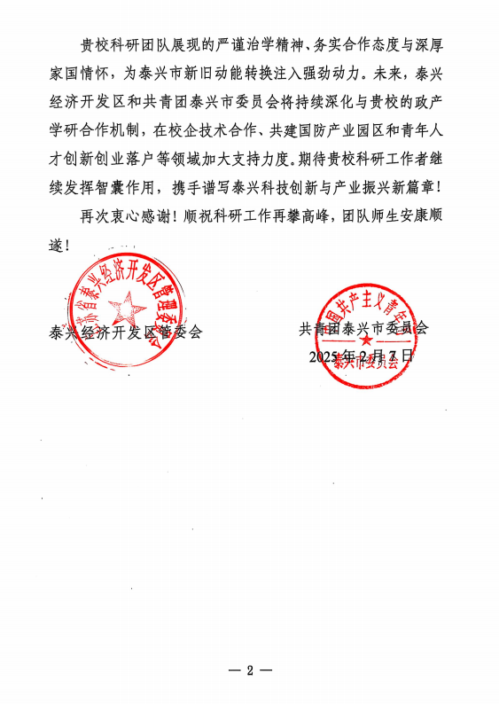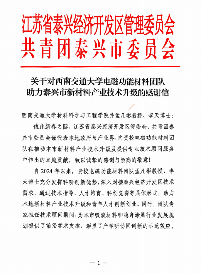 电磁功能材料团队孟凡彬教授、李天博士研究生在泰兴市吸波材料、隐身涂层等新材料军工行业的产业升级、技术指导和青年人才培育等方面作出的卓越贡献表示感谢。