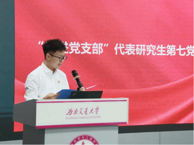 研究生第七党支部书记邰浩云作为“先进党支部”代表发言,回顾了支部近期工作并展望未来规划,展现了支部的凝聚力和战斗力,彰显了基层党组织作为学院事业发展的坚强堡垒作用。