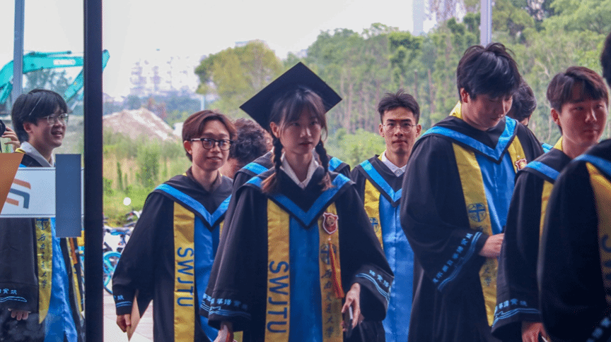 上午八点半,会议中心前厅已是学位服的海洋。各班班长和志愿者们穿梭其间,引导同学们有序入场;与此同时,工作人员循环播放饱含祝福的毕业纪念视频,整个前厅洋溢着庄重与期待,静候仪式启幕。