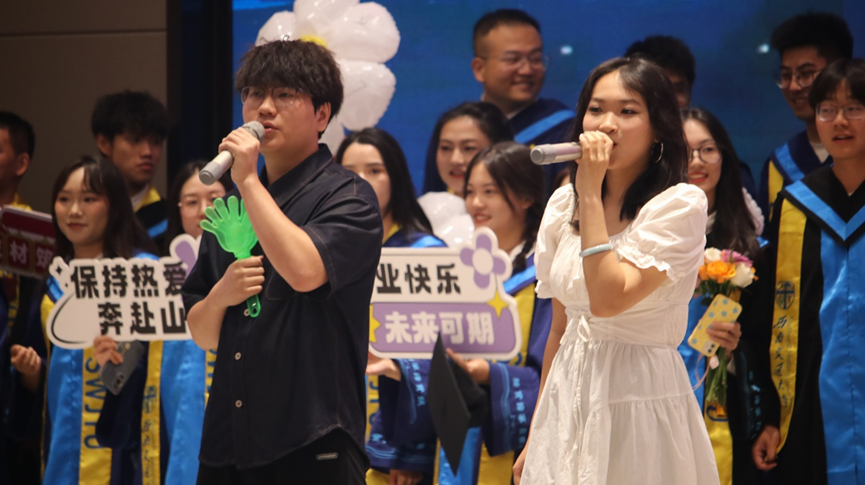 毕业会进行到第五项议程,本科生毕业代表任佳琪与研究生毕业代表刘英宗相继发言,深情致敬母校培育。