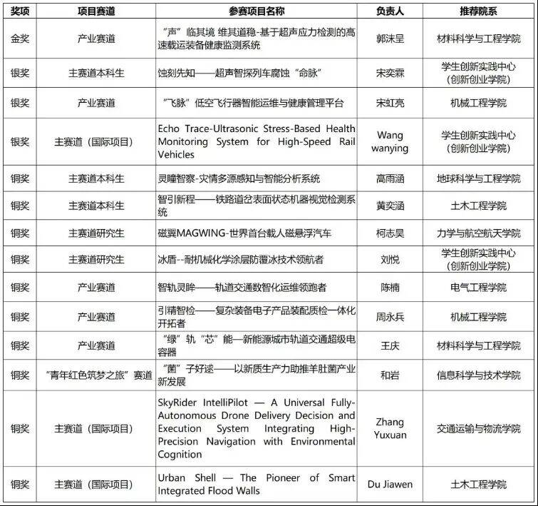 还获得3项银牌和10项铜牌,涵盖《蚀刻先知——超声智探列车腐蚀“命脉”》、《“飞脉”低空飞行器智能运维与健康管理平台》等项目,展现了学校全面的创新创业实力。