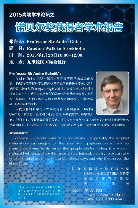 周祚万教授邀请,Andre Geim爵士教授将于2015年1月22-24日到访我校并开展学术交流。23日上午,学校将举行隆重仪式,徐飞校长将亲自为Sir Andre Geim博士颁发我校名誉教授聘书,Professor Sir Andre Geim将为全校师生作精彩的学术报告,欢迎参加。