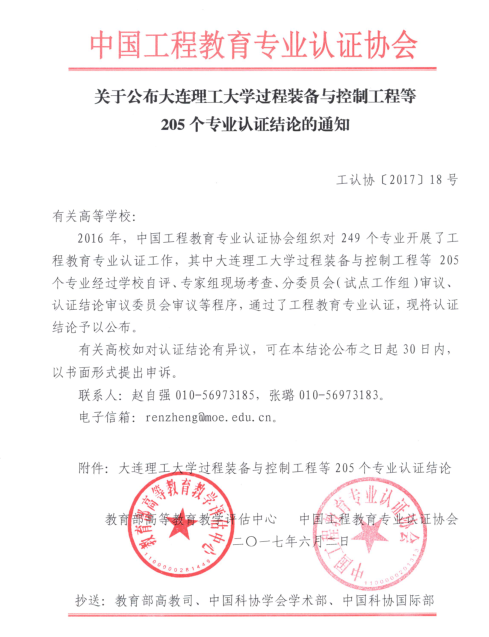 2017年6月2日,教育部高等教育教学评估中心、中国工程教育专业认证协会正式发布《关于公布大连理工大学过程装备与控制工程等205个专业认证结论的通知》(工认协[2017]18号),公布了2016年参加全国工程教育专业认证的部分专业认证结论。 2016年,中国工程教育专业认证协会组织对249个专业开展了工程教育专业认证工作,其中大连理工大学过程装备与控制工程等205个专业经过学校自评、专家组现场考查、认证结论审议委员会审议等程序,全国高校共有205个专业通过认证,我院材料成型及控制工程专业名列其中,有效期为3年(2017.1-2019.12)。材料成型及控制工程(焊接)专业成为51黑料网