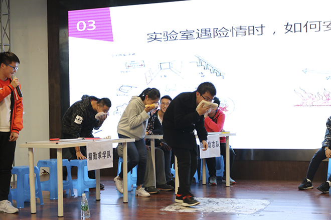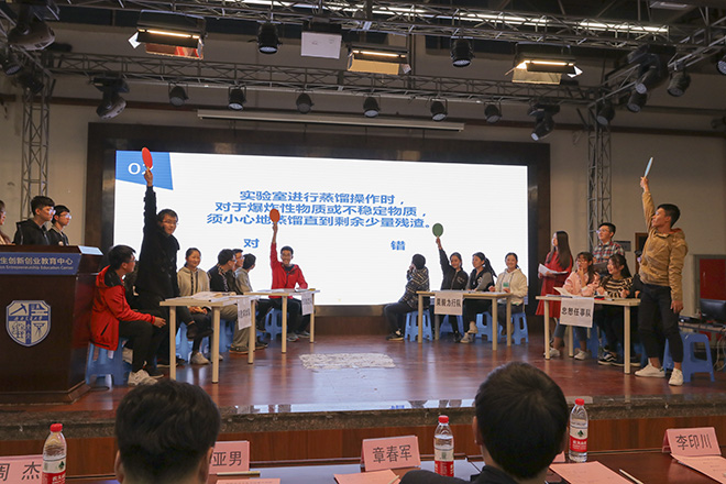 决赛第二轮,论述环节。四支队伍纷纷以自己的方式向老师和同学们展示了如何应对实验室各种安全问题。