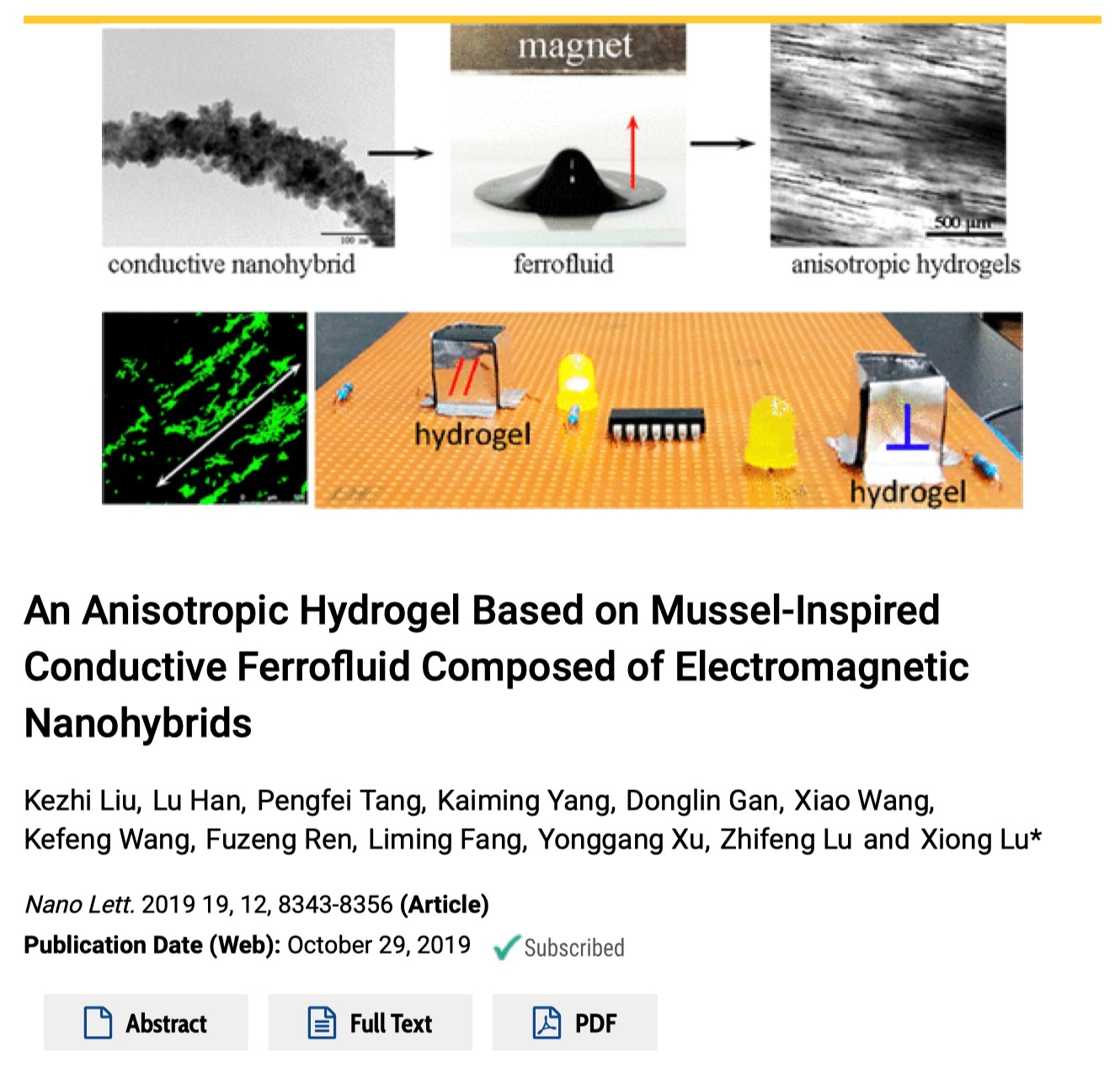 鲁雄教授为通讯作者,刘科志和韩璐博士为共同第一作者,在美国化学会旗下著名学术期刊Nano Letters(影响因子12.279)上发表的论文An anisotropic hydrogel based on mussel-inspired conductive ferrofluid composed of electromagnetic nanohybrids入选“ Top 20 most downloaded articles”。