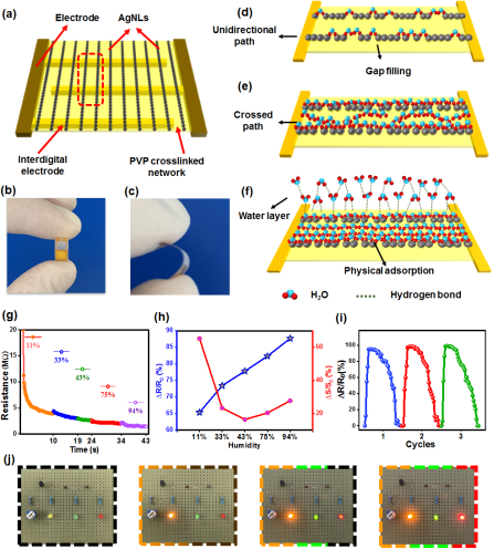 正如图二所示,该合成方法得到的AgNLs依靠纳米尺度的晶体排列结构,展现出对水分子的多级梯度吸附能力,并对低湿、中湿、高湿环境体现出不同的电子敏感和传导特性。相比传统的线性响应湿度传感器,以AgNLs为基构造的湿度传感器(ABHS),在一维纳米尺度下显示出对低相对湿度有更好的灵敏性能。
