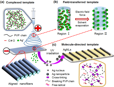 郑晓彤课题组开发了一种新的合成方法,结合静电纺丝技术和原位UV辐照在室温下得到一维成对定向排列的银纳米链(AgNLs)。这种AgNLs不同于传统的银纳米线(AgNWs),它是依靠银纳米晶体沿着纤维模板的平行界面,实现更小定向尺度的单颗粒自组装。在整个过程中,从银离子到银单质的定向合成,PVP聚合物分子链发挥了重要的模板效应,比如:在溶液混合过程起到络合模板作用、在静电纺丝过程起到电场迁移作用、以及在原位UV辐照过程起到分子定向拉伸作用(图一)。