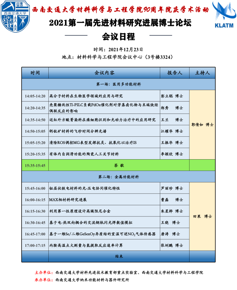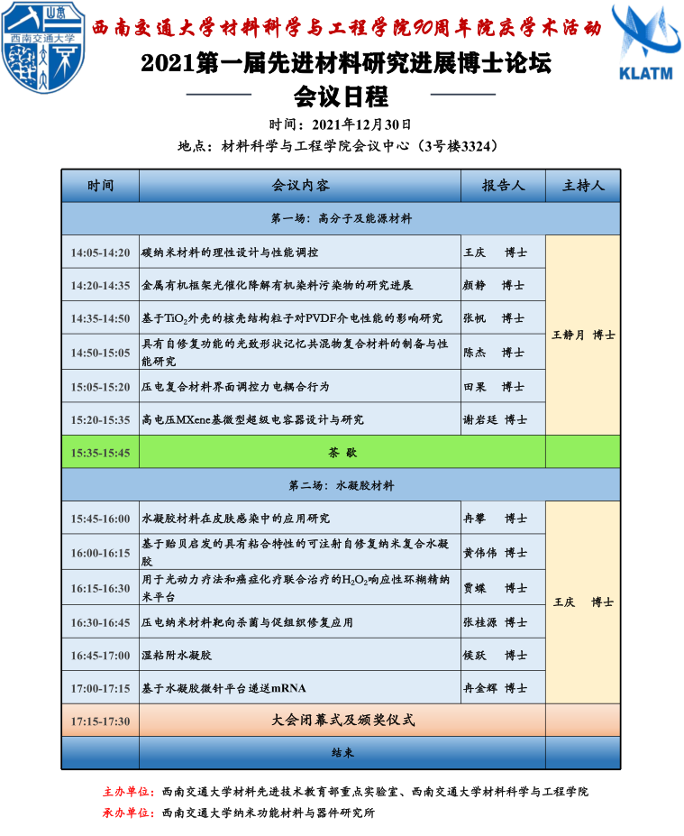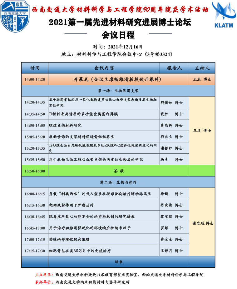 90年院庆学术活动——2021第一届先进材料研究进展博士论坛。本次论坛分为生物医用支架,生物与诊疗,医用多功能材料,金属功能材料,高分子及能源材料,水凝胶材料六个分会场,涵盖了先进材料研究前沿的36个方向,并由2021级博士进行主题报告。希望借举行此次博士论坛的契机,为材料学院科研工作者提供研究工作交流的平台,吸引更多先进材料领域的老师进行指导,开启更深层次的创新合作。