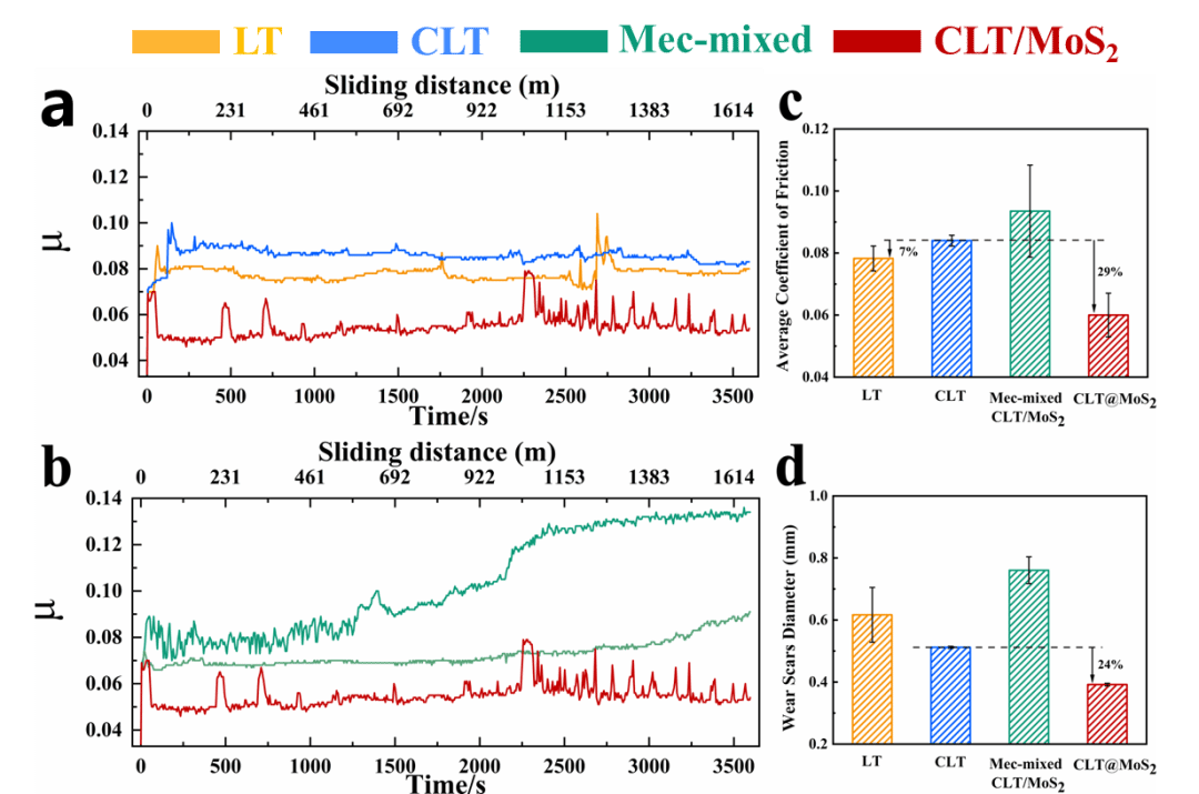 图4 (a) 四种稠化剂对应的润滑脂的四球摩擦试验;(b) Mec-mixed样品重复实验的摩擦系数曲线与CLT/MoS2的摩擦系数;(c) 平均摩擦系数;(d) 球磨斑的复合磨损量