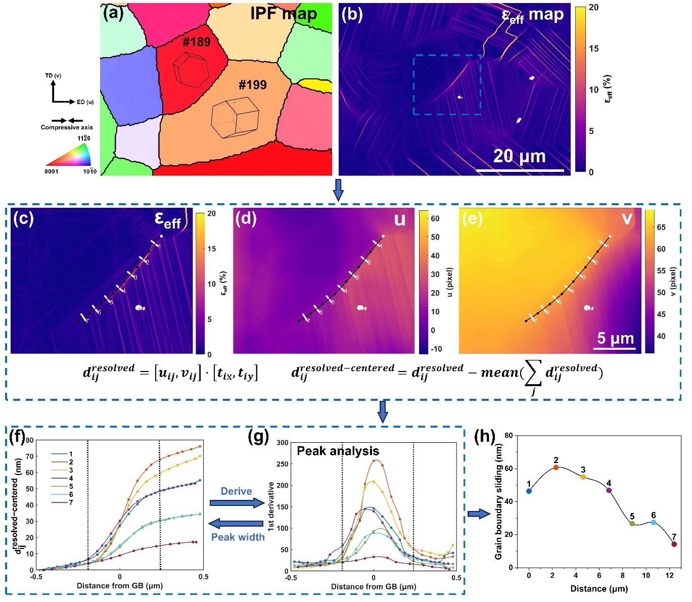 图4为利用HRDIC的位移场信息进行晶界滑动(grain boundary sliding,GBS)定量分析的示例。首先利用峰分析找到目标晶界,随后将其分成若干段,并沿每一小段晶界的中垂线的方向在晶界两侧取点(图4(c)-(e)中的白色圆点)。然后利用图中公式计算每个点的中心化的切向位移,它与点到晶界距离的关系如图4(f)所示。在图中观察到曲线的突变,表明在该处发生了晶界滑动,突变值的大小为晶界滑动值。为了自动获取突变值,对图4(f)中的曲线求一阶微分得到图4(g),随后进行峰分析,将峰宽信息赋予图4(f),便可以自动获得突变值(GBS值)。利用该方法,可获得整条晶界上的GBS值分布,如图4(h)所示。以上分析和计算均可通过MATLAB脚本实现自动化。