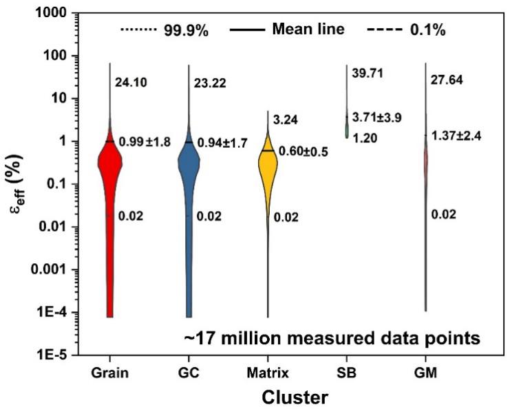 将上述聚类分析应用于研究区域内的所有晶粒,并对整个区域中每个簇的εeff进行统计分析,获得的结果以小提琴图的形式展示在图2中。注意,小提琴图的面积反映了各个簇的相对面积;同时,为了避免一些异常值的干扰,这里用99.9%分位数代表最大值。结果表明,对于整个区域来说,εeff分布高度不均匀,最大值为平均值的~25倍。不同簇的εeff分布差异很大,SB和GM中的εeff值最高,平均εeff值分别为Matrix的~6.2和~2.3倍,最大值为Matrix的~12.3和~8.5倍。但是,从面积分数来看,Matrix远大于SB和GM。