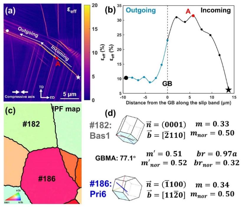 图3展示了此分析框架下滑移转移(一种重要的晶间协调机制)的分析方法。图3(a)为发生滑移转移晶粒对的有效剪切应变图,沿着滑移转移路径提取应变值,可获得滑移转移路径的应变分布曲线(图3(b)),起始点和终止点分别用五角星和圆点在图中标出。因此,根据滑移转移路径的应变分布曲线,以及滑移带形核于应变最高处的假设,可以判断出参与滑移转移的滑移系激活的先后顺序。基于EBSD取向信息(图3(c))获得的滑移转移的关键几何参数在图3(d)中示出,包括滑移面(n)、滑移方向(b)、施密特因子(m)、归一化施密特因子(mnor)、几何相容性参数(Luster-Morris参数,m’)、归一化几何相容性参数(mnor’)、残余柏氏矢量大小(br)及归一化残余柏氏矢量大小(brnor)。
