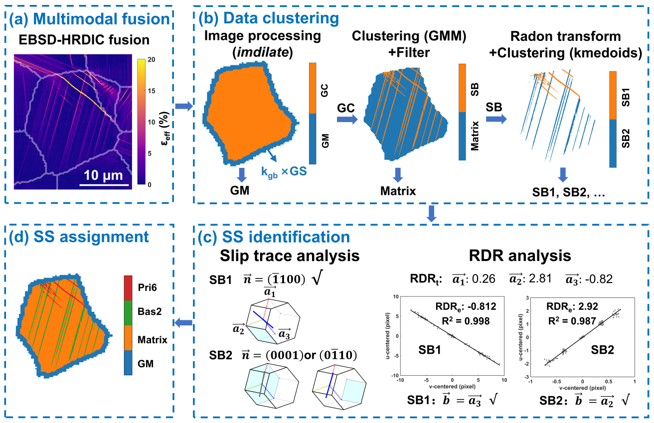 该框架核心算法主要包含如图1所示的4个部分:(a)EBSD的空间畸变矫正以及HRDIC-EBSD 数据融合;(b)利用数据聚类将每个晶粒分割为晶界附近(GM),晶内(GC),基体(Matrix)以及滑移带(SB,包含SB1,SB2);(c)利用滑移迹线分析及RDR分析进行完整的滑移系鉴定;(d)将鉴定出来的滑移系分配给上述SB1,SB2。