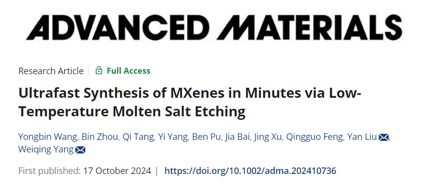 杨维清教授团队博士研究生王勇彬在材料学领域国际著名期刊《Advanced Materials》发表了题为“Ultrafast Synthesis of MXenes in Minutes via Low-Temperature Molten Salt Etching”的最新研究成果。《Advanced Materials》是世界上最负盛名的期刊之一,多年来在材料、化学、物理等学科领域位列TOP一区期刊,2024年度影响因子为27.6。该工作提出了一种全新的MXene低温熔融盐(LTMS)超快合成策略,实现了Ti3C2Tx MXene的分钟级快速制备,并成功将其推广至其他多种MXene的高效合成,为二维材料MXene的高效可扩展合成提供了行之有效的新思路。前沿科学研究院与材料学院杨维清教授、刘妍副教授为论文通讯作者,材料学院2022级博士研究生王勇彬为论文第一作者。