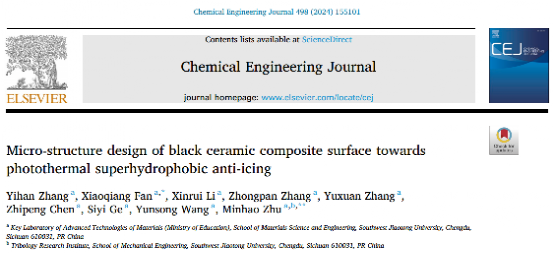 文章信息:Y. Zhang, X. Fan*, X. Li, Z. Zhang, Y. Zhang, Z. Chen, S. Ge, Y. Wang, M. Zhu*, Micro-structure design of black ceramic composite surface towards photothermal superhydrophobic anti-icing, Chemical Engineering Journal 498 (2024) 155101. //doi.org/10.1016/j.cej.2024.155101