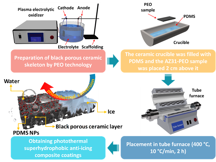 本研究利用PEO技术在AZ31镁合金表面构建了一种具有优异吸光率的多孔黑色陶瓷光热材料。通过高温沉积方案,在PEO表面修饰了大量PDMS NPs。该复合涂层具有理想的光热性能、超疏水性和防结冰效果,可归纳如下: