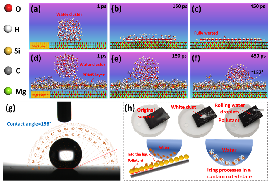 图3. (a-c) MgO表面的润湿情况。(d-f) 复合涂层表面的润湿情况。(g) 光热超疏水表面的水接触角实验。(h) 污染状态下的自清洁性能和结冰示意图。