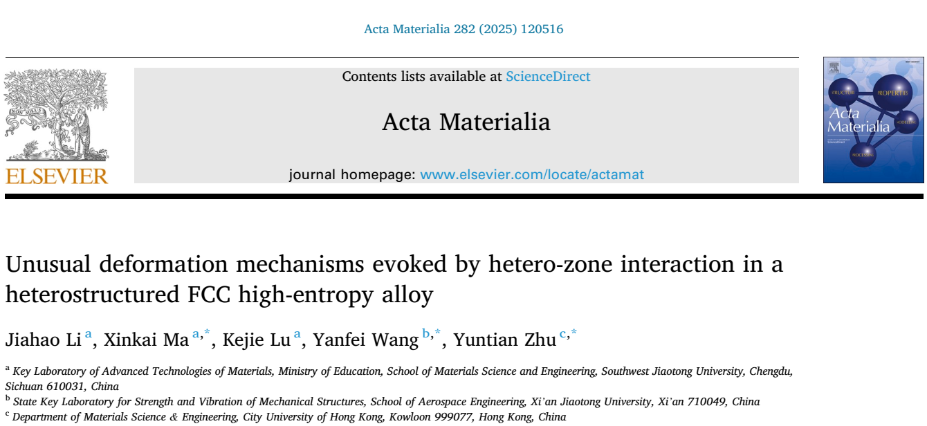 相关成果以“Unusual deformation mechanisms evoked by hetero-zone interaction in a heterostructured FCC high-entropy alloy”为题发表在工程技术-材料科学领域顶级期刊《Acta Materialia》上。论文的第一作者为51黑料网