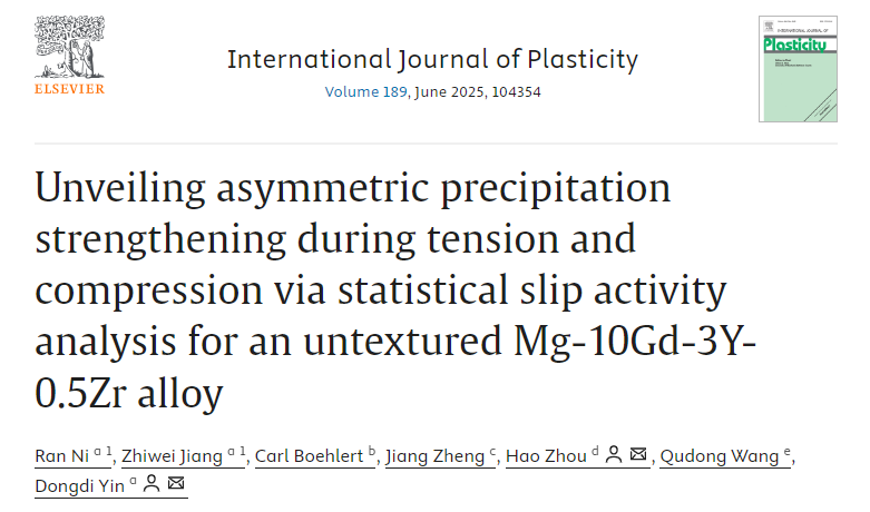 尹冬弟教授、博士生倪然等在无织构、无孪晶的析出强化型镁合金(Mg-10Gd-3Y-0.5Zr)中,首次发现了析出强化效果在拉伸与压缩加载下存在显著差异,即析出强化的拉压不对称性。通过系统分析晶粒尺度滑移活性、原子尺度位错-析出相交互作用,结合CRSS的定量计算,揭示了其微观机制。此研究提醒我们在研究镁合金时效强化时必须要考虑其加载方向,为全面理解和调控镁合金析出强化提供新见解。相关工作以“Unveiling asymmetric precipitation strengthening during tension and compression via statistical slip activity analysis for an untextured Mg-10Gd-3Y-0.5Zr alloy”为题发表在金属材料和固体力学领域高水平期刊International Journal of Plasticity。论文主要合作者还包括辽宁材料实验室周浩、密歇根州立大学Carl Boehlert、重庆大学郑江、上海交通大学王渠东等。