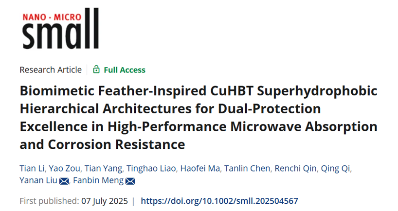 研究成果以“Biomimetic Feather-Inspired CuHBT Superhydrophobic Hierarchical Architectures for Dual-Protection Excellence in High-performance Microwave Absorption and Corrosion Resistance”发表于《Small》期刊。材料学院2022级博士研究生李天为第一作者,刘亚南特聘副研究员、孟凡彬教授为通讯作者。研究工作得到了国家自然科学基金、四川省科技计划项目、中央高校基础研究等项目支持。