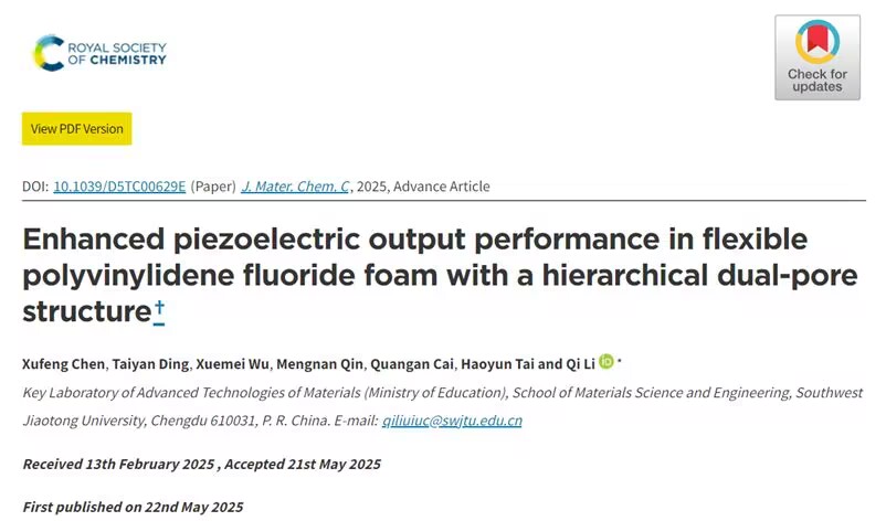 李琦教授团队最近在柔性压电材料的研究中取得了新进展,开发了一种高效且简便的方法用于制备了具有两种不同孔隙类型的多级多孔聚偏氟乙烯(PVDF)压电泡沫,相比于传统模板浇铸或冷冻干燥制备的柔性压电聚合物,能够更好地实现材料机械柔韧性和压电输出性能的协同提升,在柔性传感领域的应用更具潜力