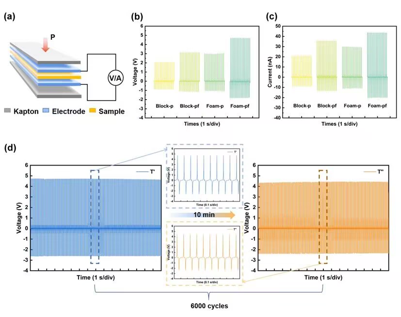 图2. 本研究中多孔柔性压电材料性压电能输出测试。