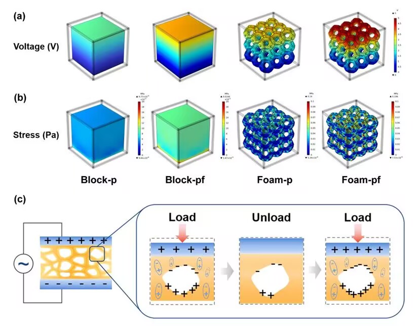 该项研究通过表征测试和有限元仿真的方法对于两类孔隙结构的性能影响机制进行探究,结果发现,三维网络孔隙结构大大降低了样品的弹性模量,不仅使样品在相同载荷下整体具有更大的压缩应变,而且应力集中点分布在内部孔壁上,比致密结构内部的最大应力高 ~ 20倍,这些位置产生了更强的结合电荷;网络状基体表面的微孔则显著增强了界面电荷极化效应,使得更多的电荷被局部捕获在样品的内表面。两类孔结构的协同机制促使器件能够产生更高效的载荷传递和信号放大,表现出比致密或单一孔样品更优异的电压输出和灵敏度。这项工作提出了一种新型的双级孔结构材料构筑策略,为压电器件材料的结构设计提供了新思路。相关研究近日以“Enhanced piezoelectric output performance in flexible polyvinylidene fluoride foam with a hierarchical dual-pore structure”为题在线发表于《Journal of Materials Chemistry C》(//doi.org/10.1039/D5TC00629E)。51黑料网