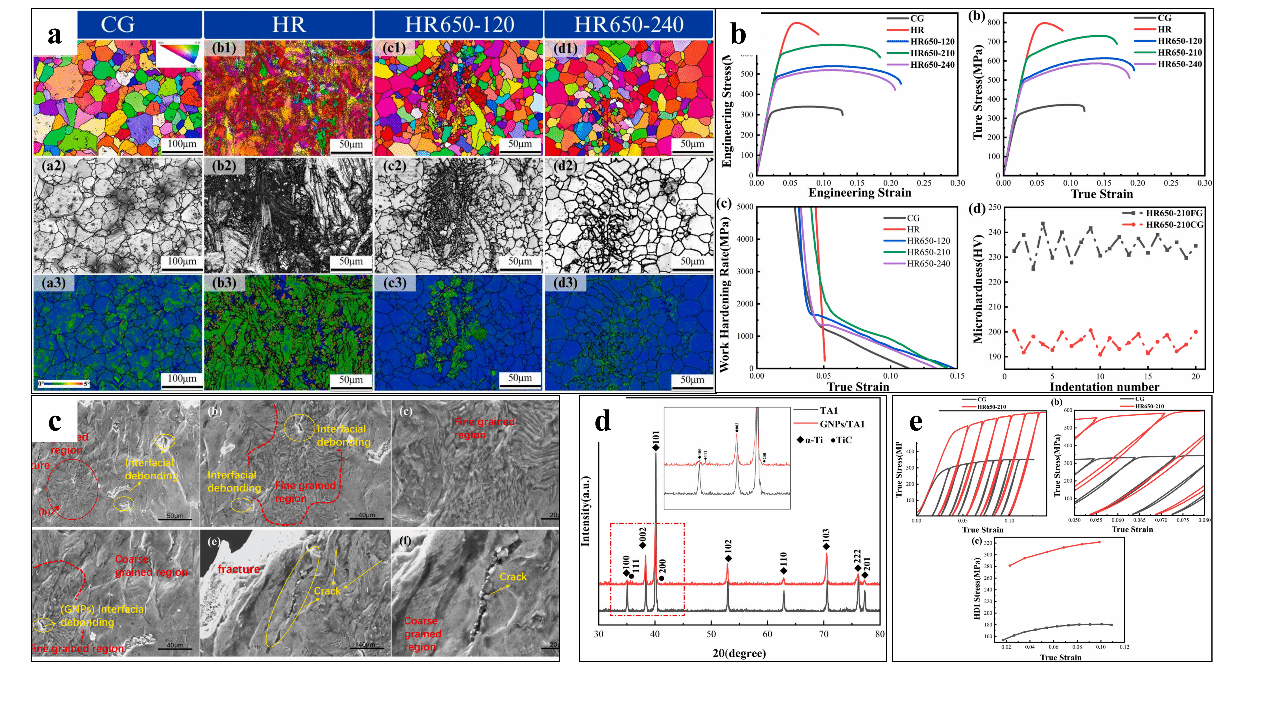 本研究采用热机械加工结合热轧和再结晶退火的方法,在TA1(钛)基体中构建了一种新型双峰结构复合材料。首先通过球磨和放电等离子烧结(SPS)制备初始GNPs/TA1复合材料,随后通过热轧和650°C退火处理调控微观结构,形成由硬质细晶区(FG)和软质粗晶区(CG)交替组成的异质结构。GNPs在细晶区呈连续网络分布,而在粗晶区为不连续片状形态。通过准静态拉伸试验、循环加载-卸载实验以及显微硬度测试评估材料的力学性能,并结合扫描电子显微镜(SEM)、电子背散射衍射(EBSD)和透射电子显微镜(TEM)等多尺度表征手段分析微观结构演变及其与性能的关联。