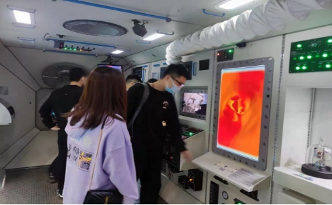 在这里我们看到了许多关于航空航天的尖端科技,且这些设备不仅有相应的介绍,还提供了给参观者操作的机会。比如有一个模拟火箭发射过程的一个设备,参观者可转动手轮发电,电解水产生氧气和氢气。在按下点火按键后气罐内的混合气体点火,火箭模型便会飞起。而在实际火箭发射中便是以液氧和液氢作为航天航空工业用燃料。在参观过程中,同学们兴致勃勃,对航空航天领域的技术感到非常好奇。