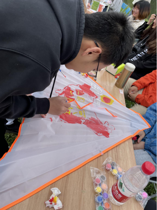活动的第二部分是风筝放飞活动——“筝寄家国情”,领取样板风筝后,同学们充分调动了自身的主观能动性,用绘画与文字表达自己对党和国家的由衷赞美,“东方雄狮”、“中国雄鸡”等主题风筝异彩纷呈,现场洋溢着浓浓的家国情和幸福感。
