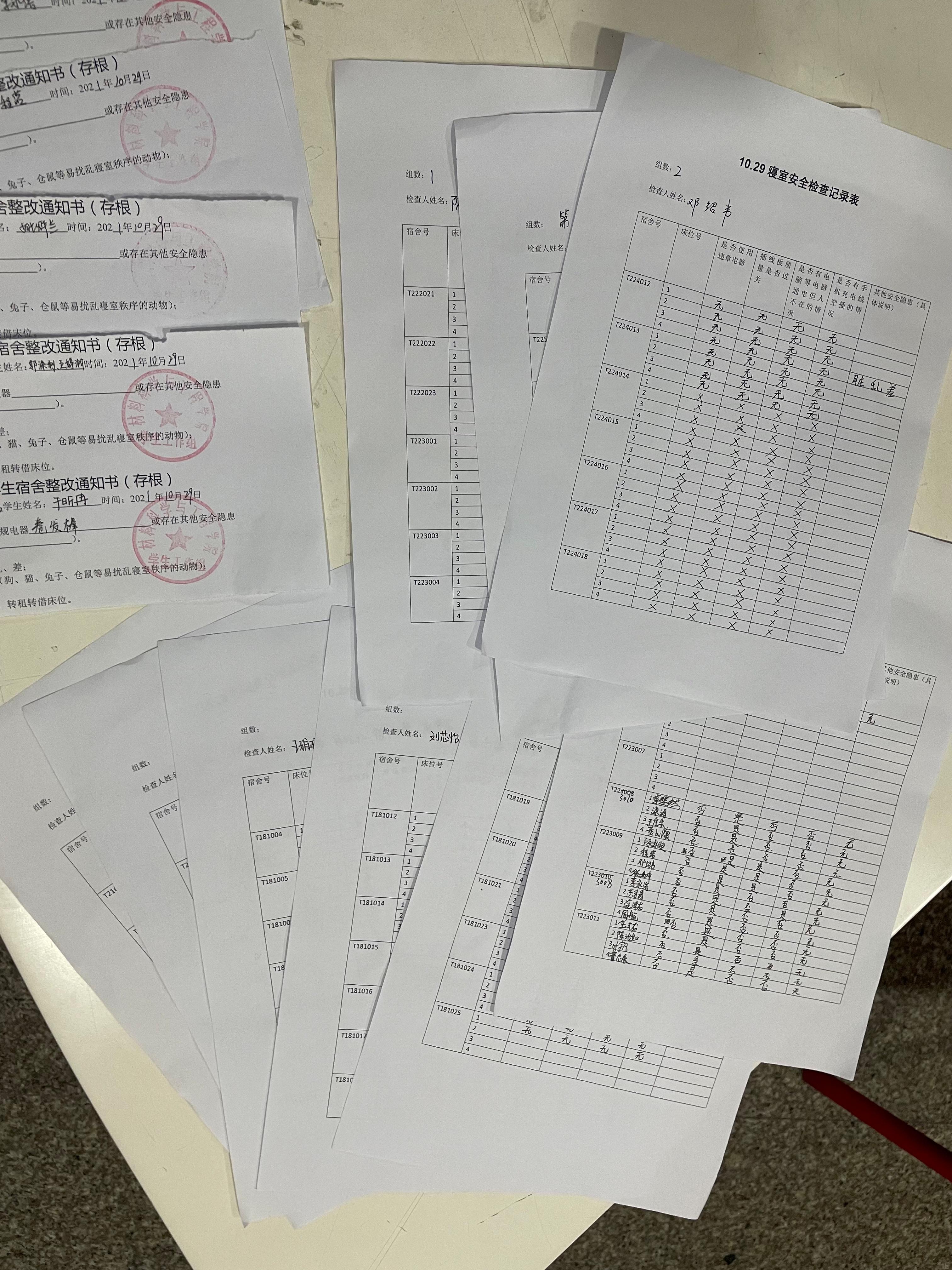 所有参与查寝的同志共分为三组,分别对天佑斋18栋、20栋、21栋的宿舍进行了检查。首先检查宿舍卫生,提醒同学们冬季多开窗通风换气,随后就宿舍成员是否使用大功率电器、违章电器,是否使用三无电器产品,是否危险用电等方面进行了细致地排查。在排查过程中,同志们发现部分宿舍存在插头空插、私拉乱接等安全隐患,责令同学们立即整改,避免以后再出现危险用电情况,同时在宿舍安全检查登记表上作了详细记录,并对学生下发整改通知。