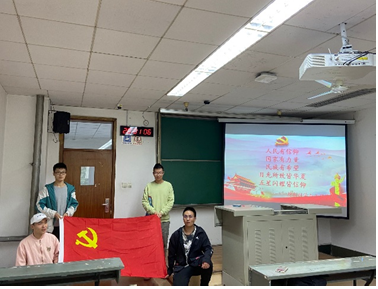 青年兴则国家兴,青年强则国家强,青年一代有理想、有本领、有担当,国家就有前途,民族就有希望。为了扎实推进班级主题教育,增强同学们的爱党、爱国热情,2021年10月15日下午13:00,2021级硕士5班全体同学在J4305B顺利开展了“不忘初心,牢记使命”主题教育暨“我与党旗合个影”活动。此次活动共三项议程,由郑学超同学主持。