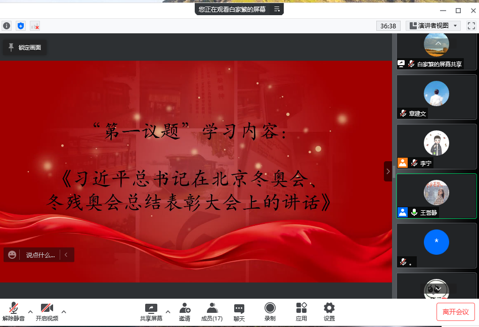 委员会关于落实“第一议题”制度的实施办法》,材料学院研究生第十党支部在主题党日活动开始前,严格落实“第一议题”制度,由王誉静同志带领全体党员学习了《习近平总书记在北京冬奥会、冬残奥会总结表彰大会上的讲话》,通过对讲话精神的学习,积极引导青年学生、党员同志更加紧密的团结在党中央周围,发扬北京冬奥精神,以更加坚定的自信、更加坚决的勇气,向着实现第二个百年奋斗目标奋勇前进,向着实现中华民族伟大复兴的中国梦奋勇前进。同时向全体成员明确提出要求,号召全体与会同志、同学加强自身锻炼,增强身体素质,以更好的精神面貌投入到科研学习中。